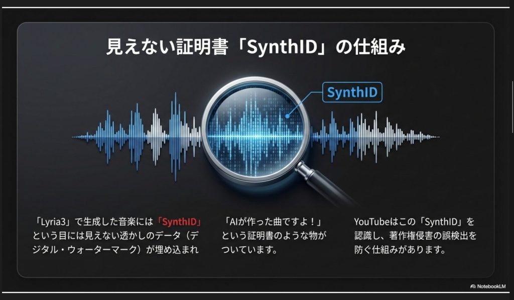 「Lyria3」で生成した音楽には「SynthID」という、私たち人間の目には見えない
