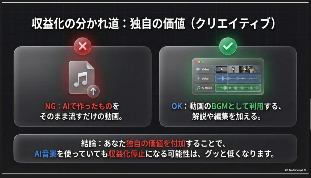 「Lyria3」で生成した音楽を使った動画が全て収益化停止となるわけではありません。